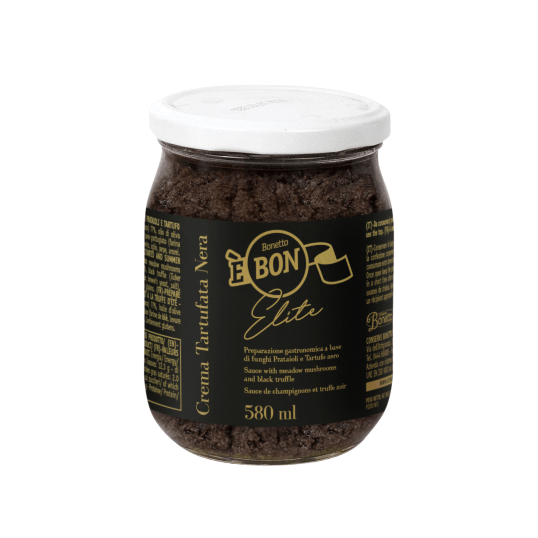 La Crema Tartufata Elite EVO Bonetto es una exquisita mezcla de setas cultivadas (Agaricus bisporus), trufa de verano (Tuber aestivum Vitt.) y aceite de oliva virgen extra, ingredientes que se combinan para crear una textura cremosa y un sabor profundo, con notas terrosas y delicadas.